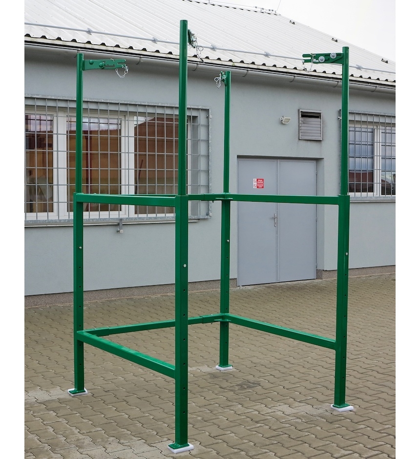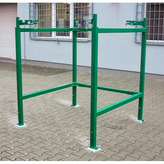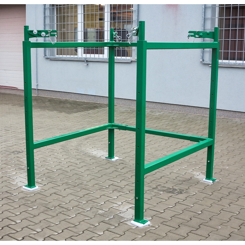 Tento stojan má zesílenou konstrukci (z jeklu 60x60x4 mm) a má nastavitelnou výšku háčků od 145 do 250 cm, proto je vhodný pro různé větší velikosti Big-Bagů. Délka úchytů je také nastavitelná, díky tomu lze tento stojan použít pro Big-Bagy s půdorysem od 90x90 do 110x110 cm.