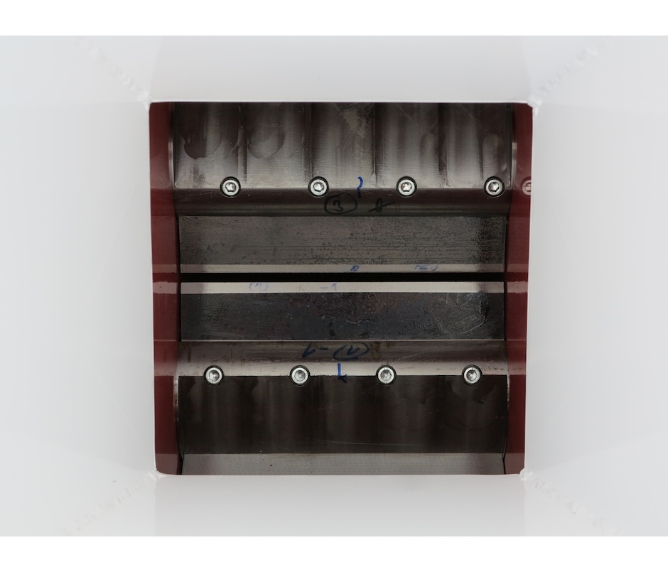 Štěpkovací ústrojí pracuje na principu dvou protiběžných hřídelí s noži. Štěpkovací nože si větve samy podávají. Průchozí mezera mezi hřídelemi je 110 mm. Štěpkovací nože jsou zasunuté do drážek v hřídelích a uchyceny pomocí čtyř šroubů. Nože vyrábíme z kvalitní nástrojové oceli a je možné je opakovaně brousit. Po nabroušení se pod nůž vloží podložka, aby mezi ostřím nožů byla opět malá mezera (cca 0,1 mm). Podložky dodáváme v různých tloušťkách. Jedním broušením se nůž obvykle sníží o 0,5 až 0,8 mm. Na jedno nabroušení vyrobí nože 150 až 800 m3 štěpky (cca 1500 až 8000 rašlových pytlů), záleží kolik se do štěpkovače dostává nečistot (hlína, kamínky,…). Každý nůž je možné zbrousit až o 4 mm, poté je třeba ho vyměnit za nový.